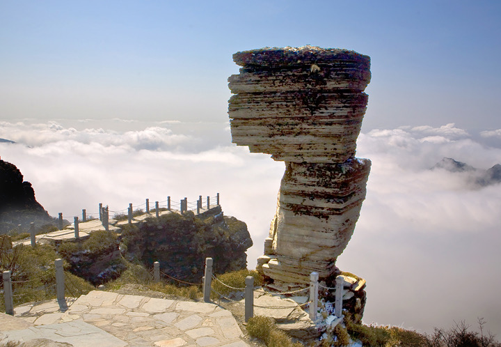 都说梵净山365天有300多天都是雾气缭绕的天,意外的是天气竟然放晴起来,同行的本地人说已经连续半个月阴天了,我们的运气真是不错呢! 大概行进了约20分钟后,便到达梵净山最具代表性的山石景观——蘑菇石。其形象就和它名字一样,酷似蘑菇。大自然的确是个举世无双的雕刻家,才能造就出如此经典多样的形象来。蘑菇石已经在风霜雪雨飘摇中屹立了10亿年以上,这是造物主举世无双的一座魔幻现实主义景点雕塑。