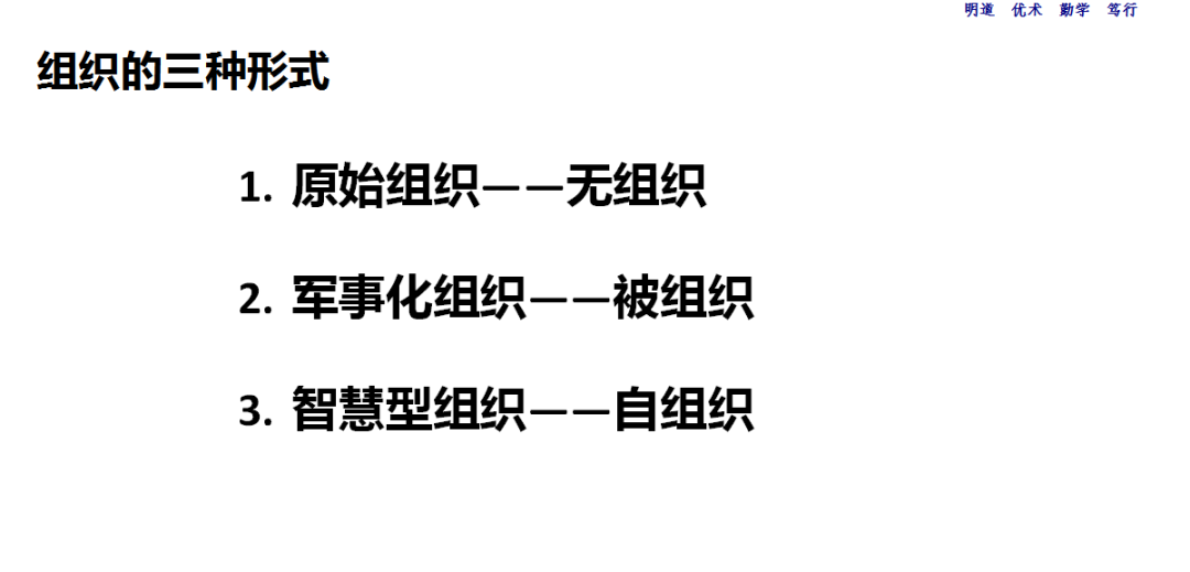 原始组织是一种无组织,处于自发阶段;军事化组织是被组织,人是被动状态,也就是马克思和众多解读工业化、现代化思想家所提出的“人的异化”状态;智慧型组织是一种自组织,能够激发人的主观能动性和创造力。在智慧型组织里,人不再是一颗螺丝钉,不再是流水线上的零部件,董李会长说,智慧型组织让一个人就是一支军队,真正能够做到“一夫当关,万夫莫开”,人为战。