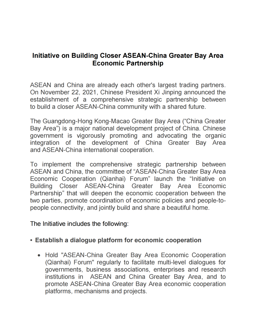 为将中国-东盟全面战略伙伴关系行动计划落到实处,进一步深化大湾区—东盟经贸合作、促进民心相通,推动大湾区与东盟经济政策对接和共建共享繁荣家园,为此,大湾区-东盟经济合作(前海)论坛组委会发起“关于建立大湾区—东盟经济合作关系的倡议”,内容如下: