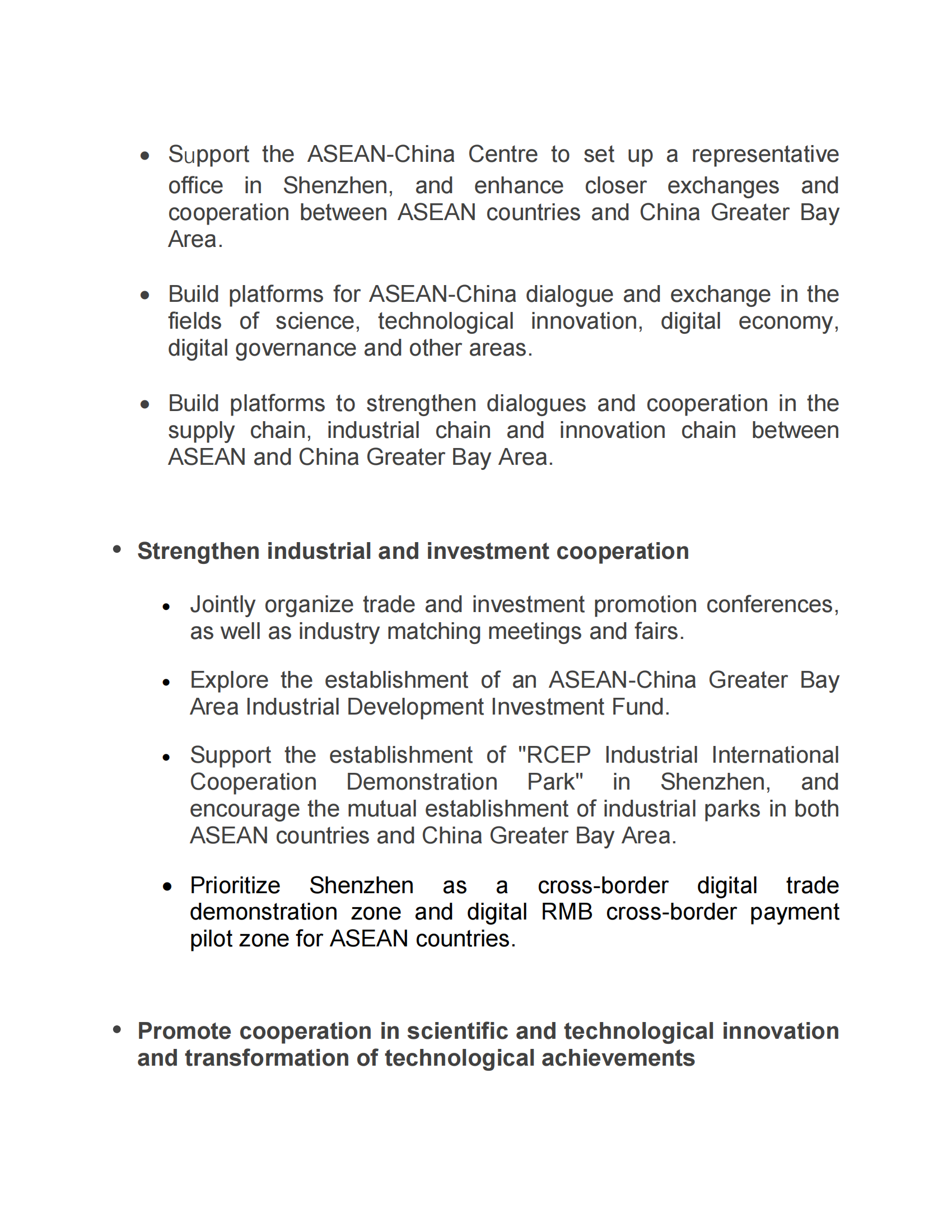 ※落实中国—东盟领导人有关科技创新和数字经济合作伙伴关系行动计划,推动在深圳设立“中国—东盟数字经济合作示范区”。